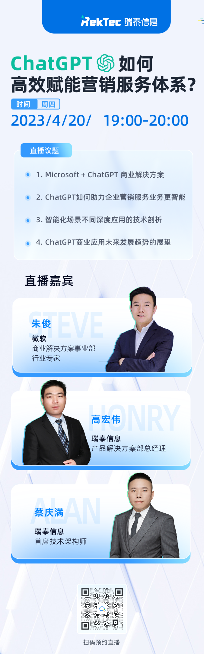 4月20日19:00-20:00,小瑞學苑邀請到微軟商業解決方案事業部行業專家朱俊、瑞泰信息產品解決方案部總經理高宏偉、瑞泰信息首席技術架構師蔡慶滿,為大家帶來主題為“ChatGPT如何高效賦能營銷服務體系”的主題分享。